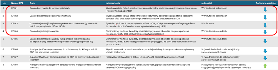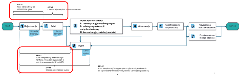 Kluczowe wskaźniki wydajności (KPI) procesu SOR wraz ze wskazanymi trzema kluczowymi czasami czynności bezpośrednio wpływających na skuteczność ratowania życia pacjenta (KPI #1-3)