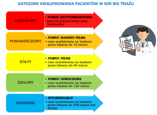 Zgodnie z §6 ust. 9 rozporządzenia Ministerstwa Zdrowia ws. SOR, szpitalny oddział ratunkowy zobowiązany jest do kwalifikacji pacjentów według triażu (ESI 1-5, kolor czerwony – niebieski) oraz do realizacji badania przez lekarza w wyznaczonych czasach. Czas wskazany w rozporządzeniu jest równoznaczny ze wskaźnikiem KPI #3.