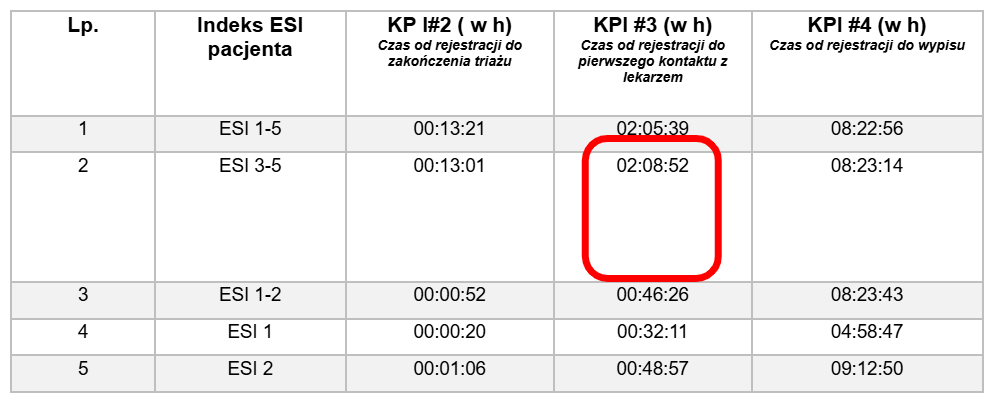 Za pomocą danych z systemu HIS wyliczone zostały kluczowe wskaźniki procesu SOR (KPI #2-4), w powiązaniu z indeksem ESI pacjenta (emergency severity index – jednolity system segregacji medycznej pacjentów szpitalnych oddziałów ratunkowych), co pozwoliło na bardziej precyzyjny przegląd sytuacji. Wyniki przedstawiono w tabelach.